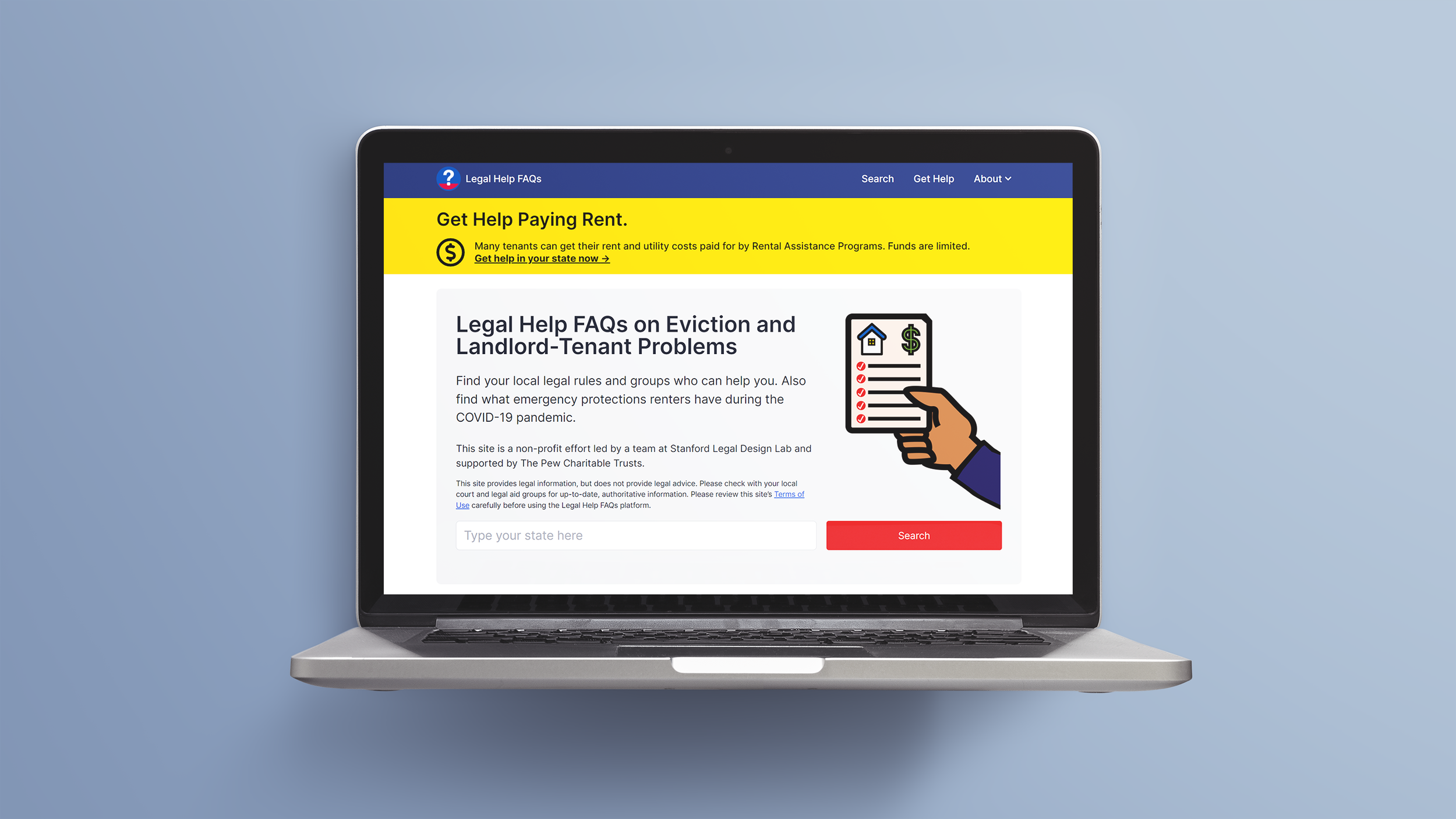 When cities began rolling out Emergency Rental Assistance Programs (ERAP) during the height COVID-19 pandemic, many people did not know how to access available funds. LegalFAQ.org↗, a platform that provides information and resources to help people facing housing-related legal issues, wanted to change that. My challenge was to direct clients to rental assistance funds available in their state. After conducting some quick user research, I designed an emergency alert banner and breadcrumb trail for the LegalFAQ.org homepage.